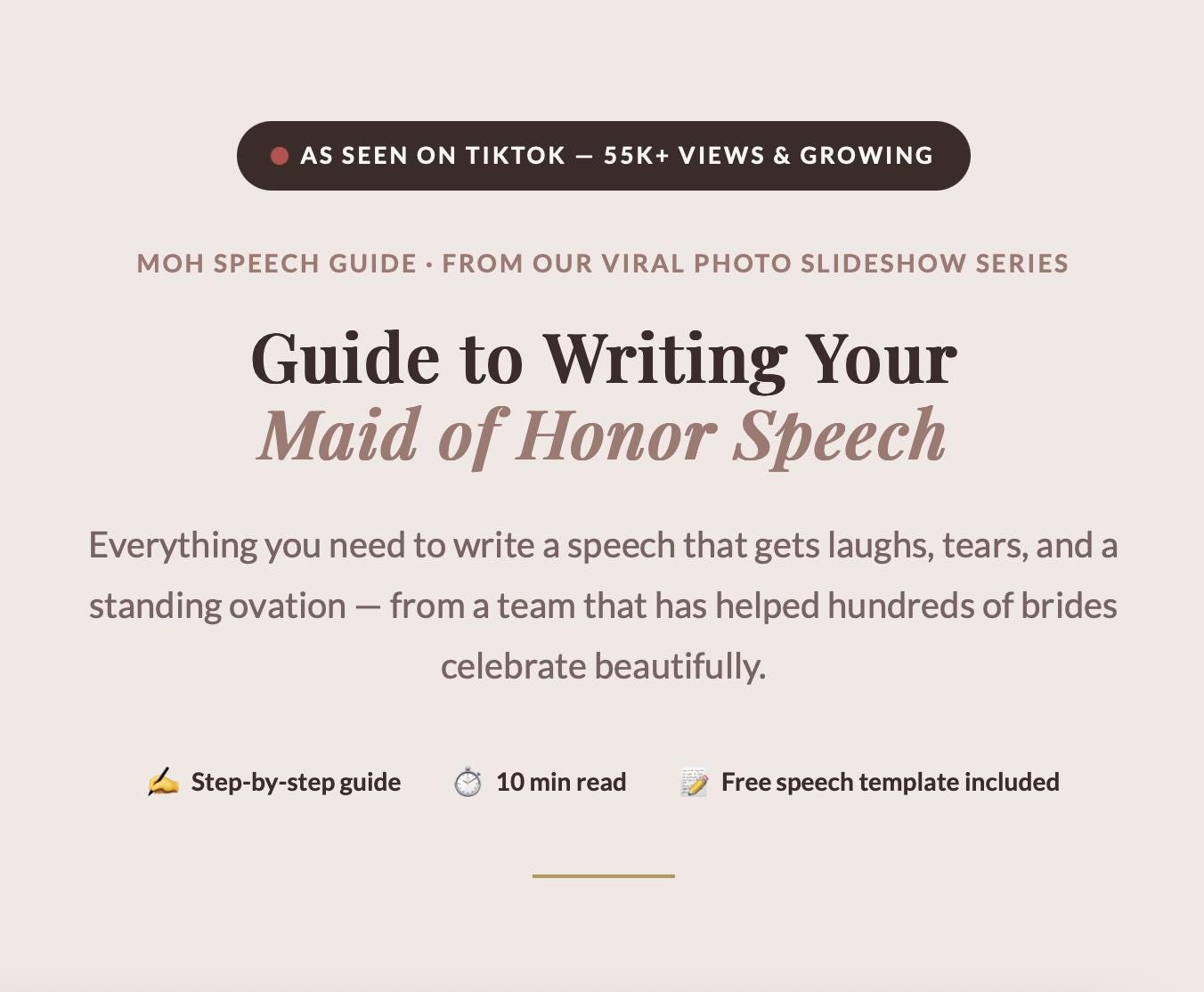 Maid of Honor Speech Everything you need to write a speech that gets laughs, tears, and a standing ovation — from a team that has helped hundreds of brides celebrate beautifully.