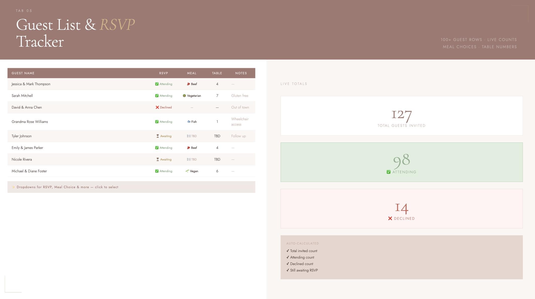 Track 100+ guests with RSVP status, meal choices, table numbers, and a live count of who’s attending. Say goodbye to scattered spreadsheets.