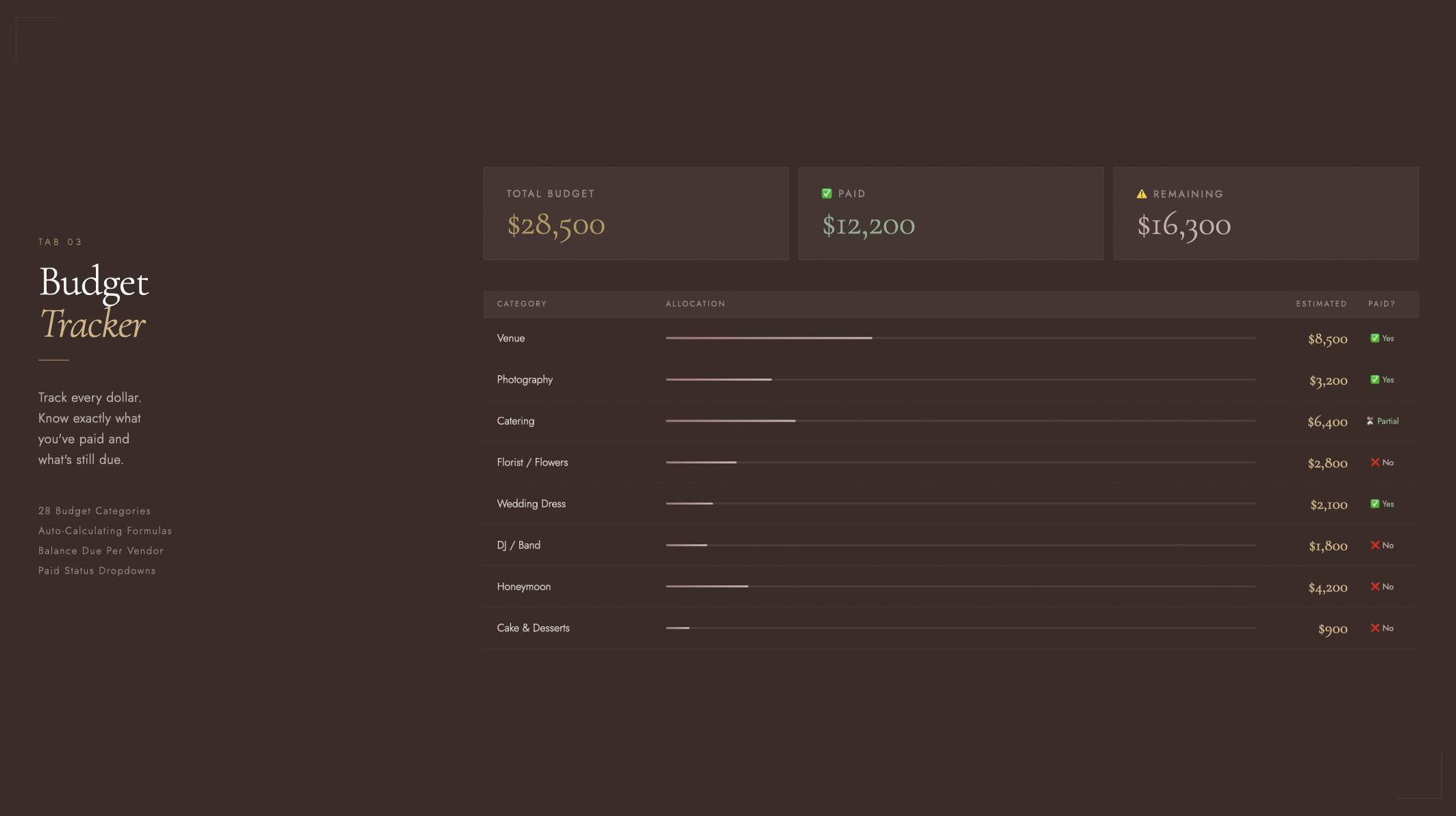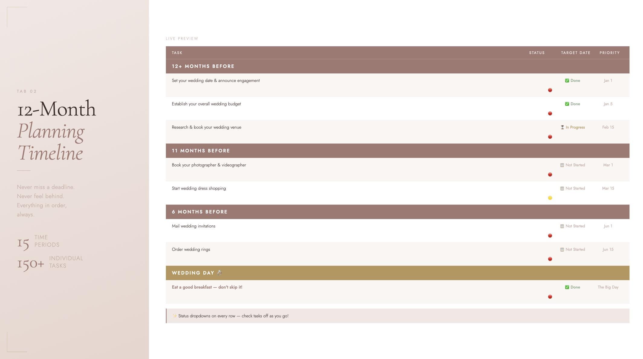A step-by-step checklist from 12+ months before your wedding all the way through your after-wedding to-do's. Status dropdowns so you can check things off as you go. Never miss a deadline again.