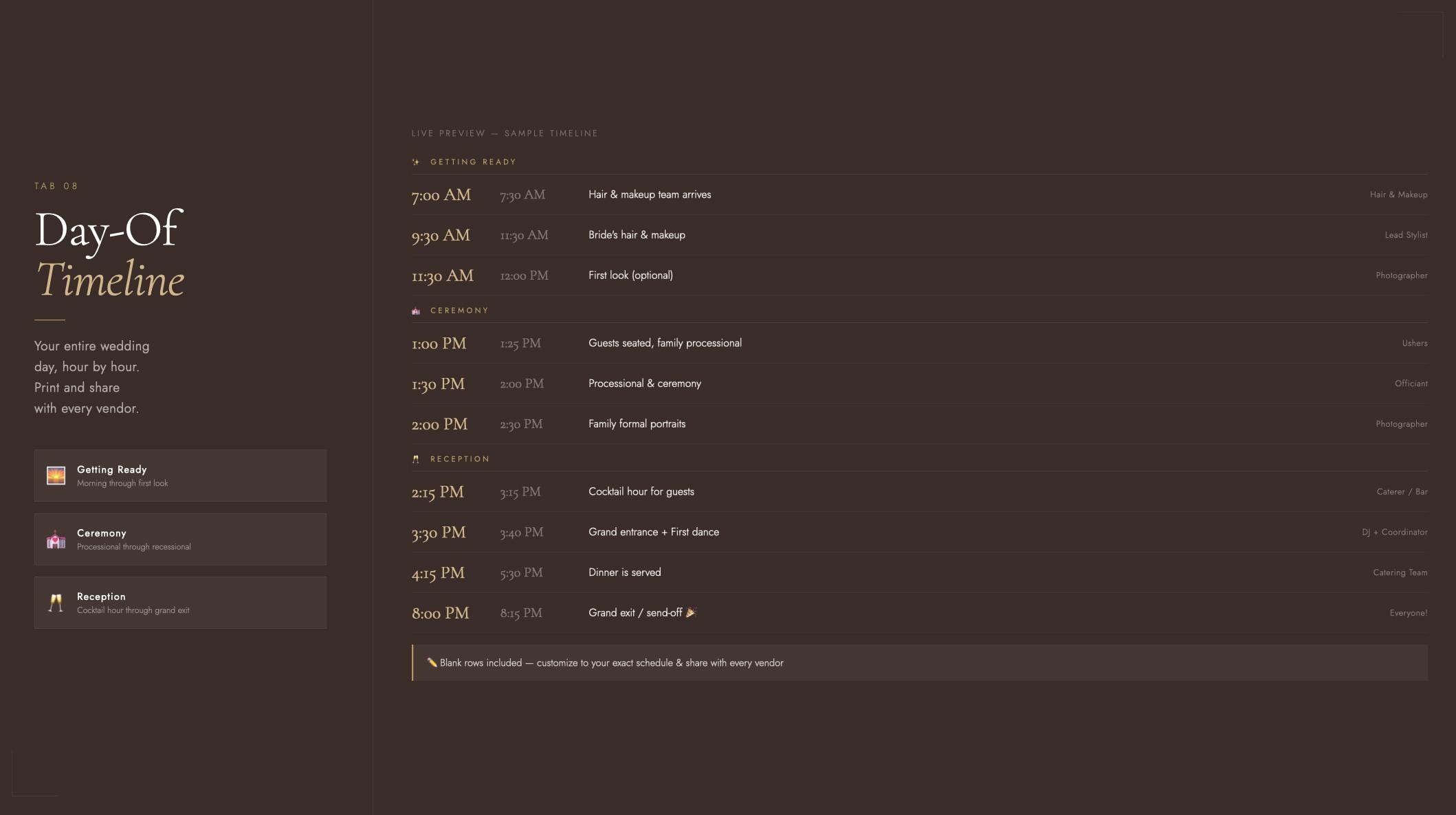 A pre-filled sample wedding day timeline (6 AM through grand exit) plus blank rows to customize your exact schedule. Print and share with every vendor.