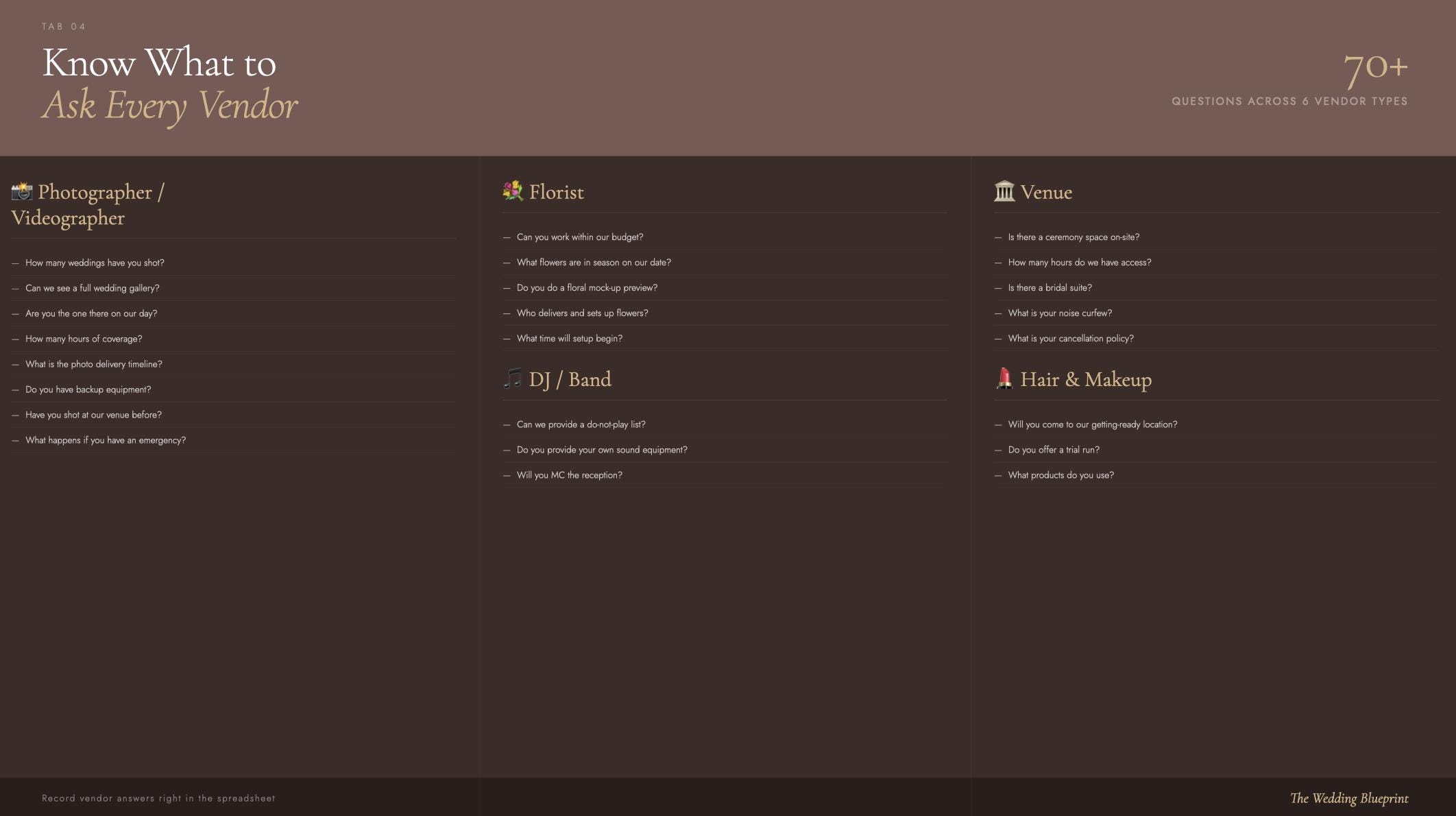 Know exactly what to ask your photographer, florist, DJ, caterer, venue, and hair & makeup artist. Record their answers right in the spreadsheet.