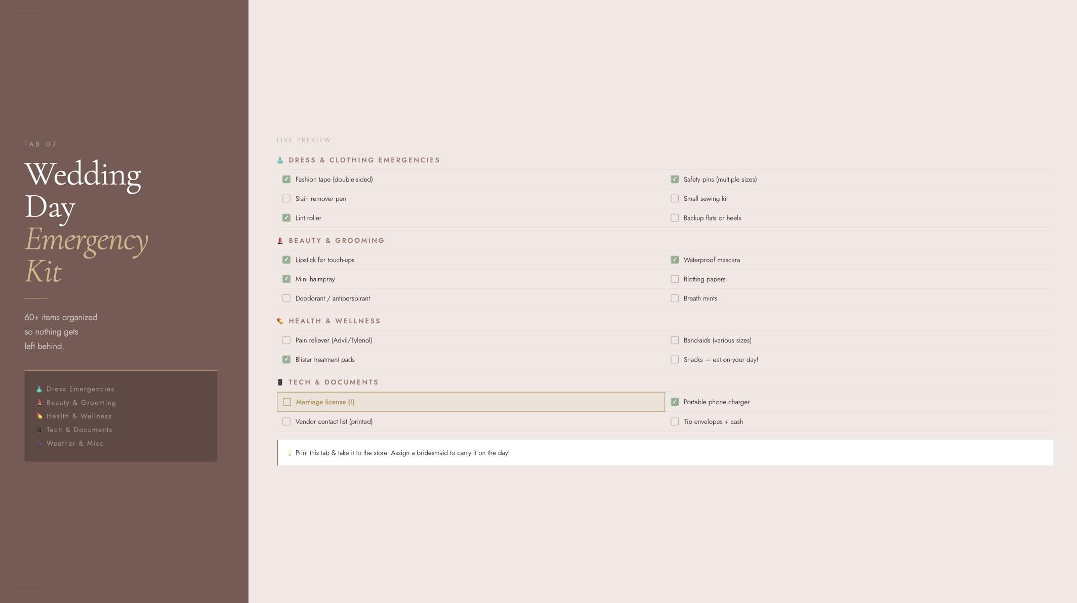From fashion tape to pain reliever to your marriage license — every item you need for a stress-free wedding day, organized by category.