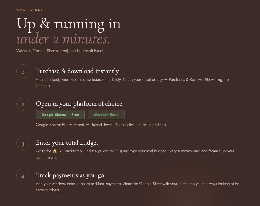 Newly engaged couples setting a wedding budget β’ Brides tracking vendor payments β’ Budget-conscious couples who need full visibility on spending β’ Couples managing wedding debt or payment plans β’ Anyone looking for a Google Sheets budget spreadsheet thatβs already built and ready to use