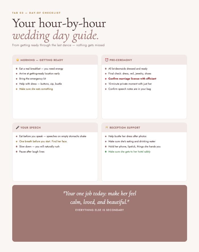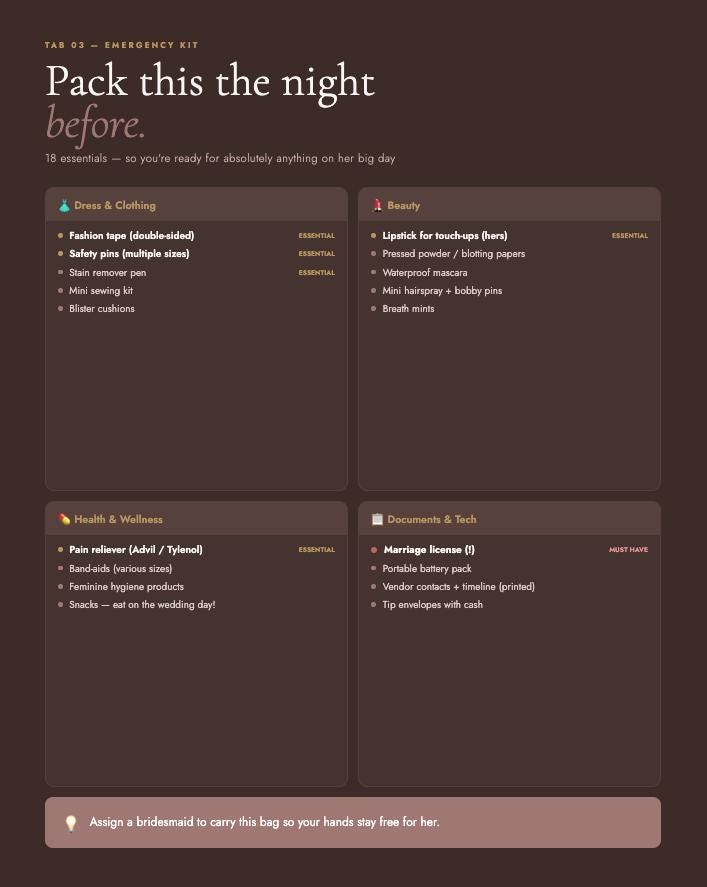 Hour-by-hour wedding day guide plus a complete 18-item emergency kit list so you’re ready for absolutely anything.