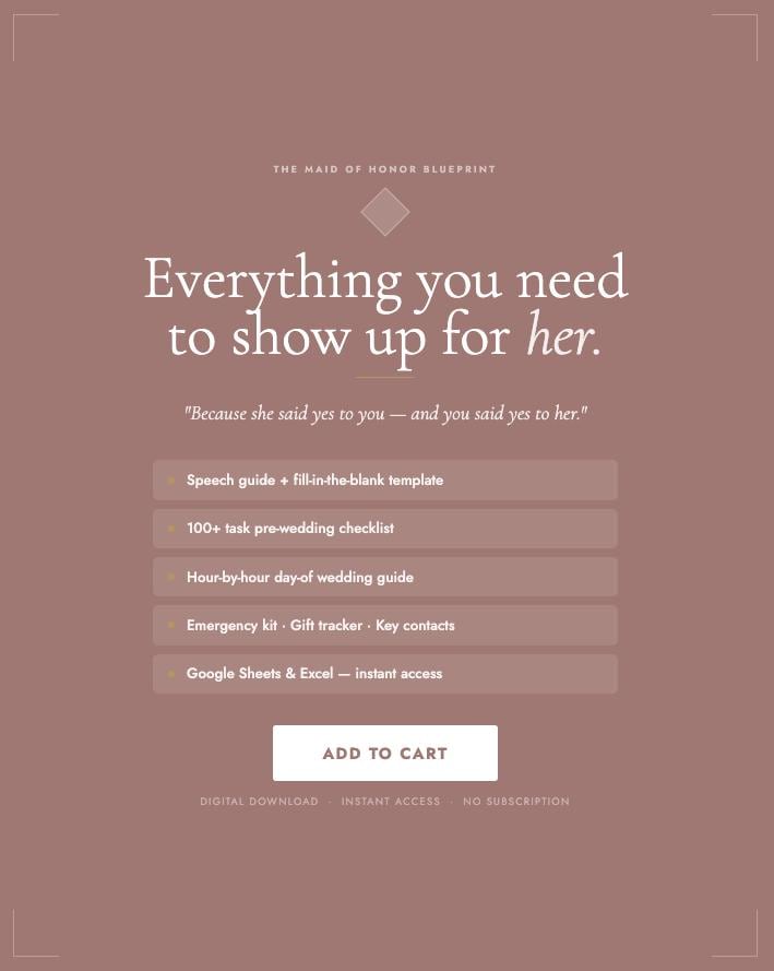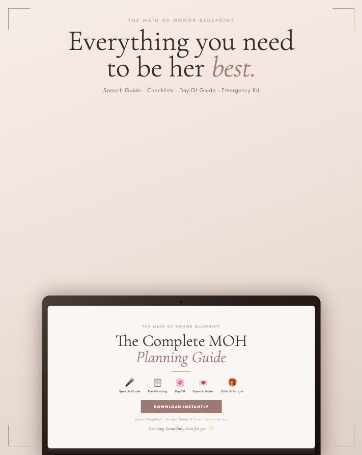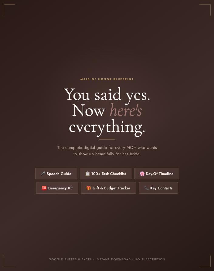 The Maid of Honor Blueprint includes everything: the speech guide, wedding checklists, day-of timeline, emergency kit, gift tracker, and key contacts — all in one beautifully designed file that works in Google Sheets (free) and Excel.