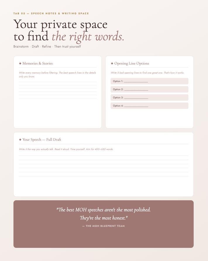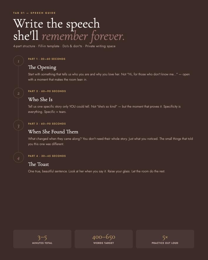 Step-by-step guide to writing the speech she’ll remember forever. 4-part structure, timing guide, do’s & don’ts, complete fill-in-the-blank template, and a private speech-writing space.