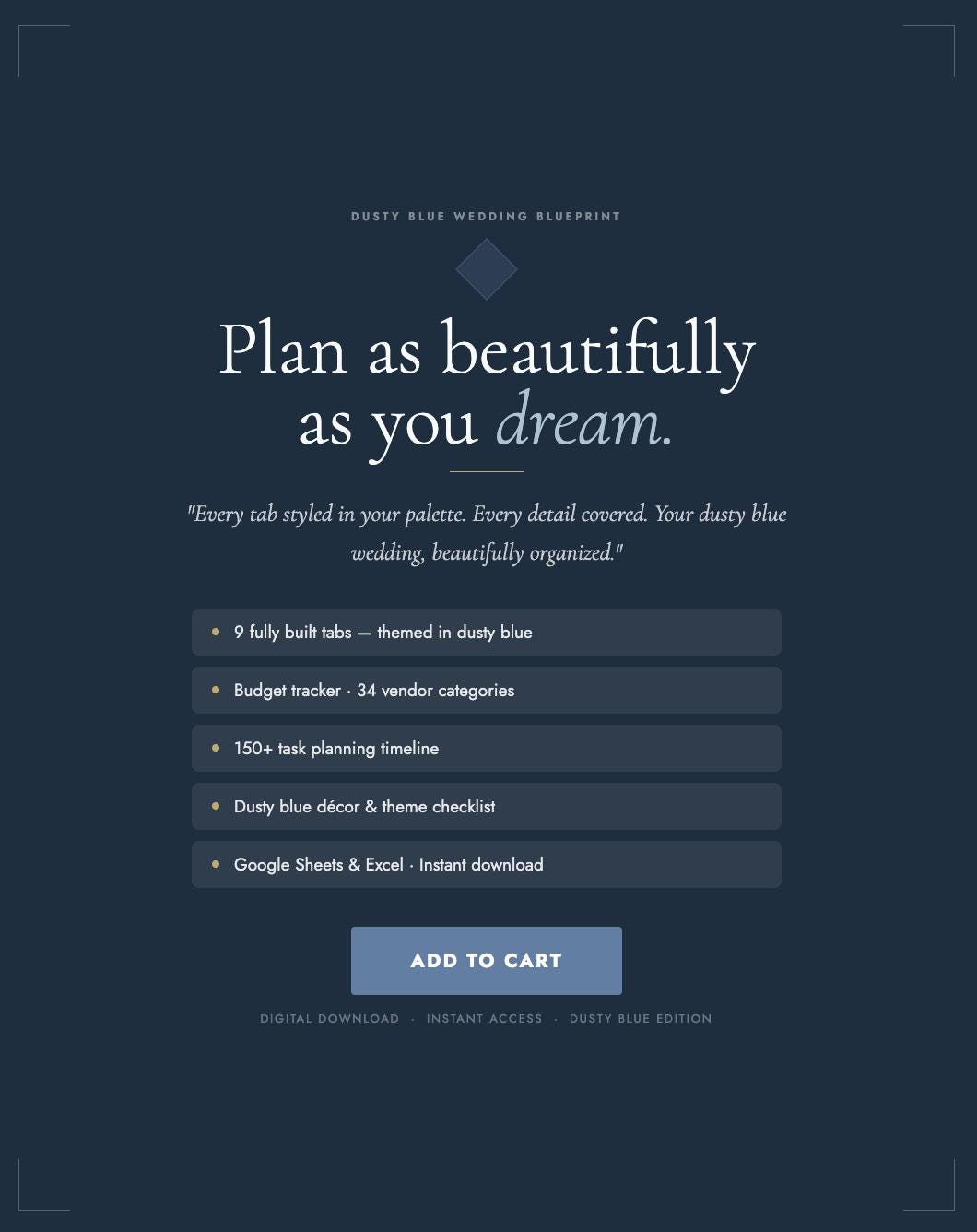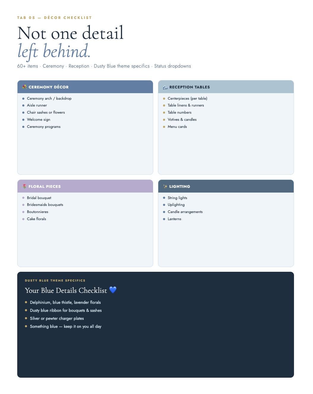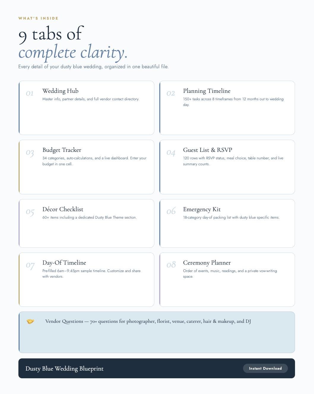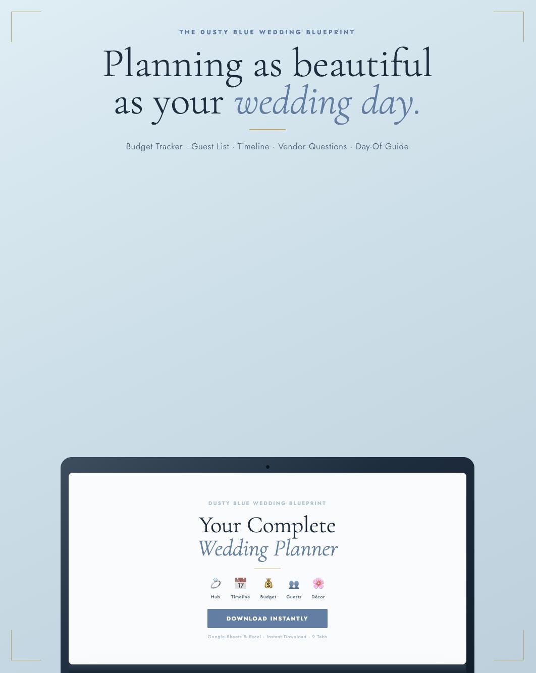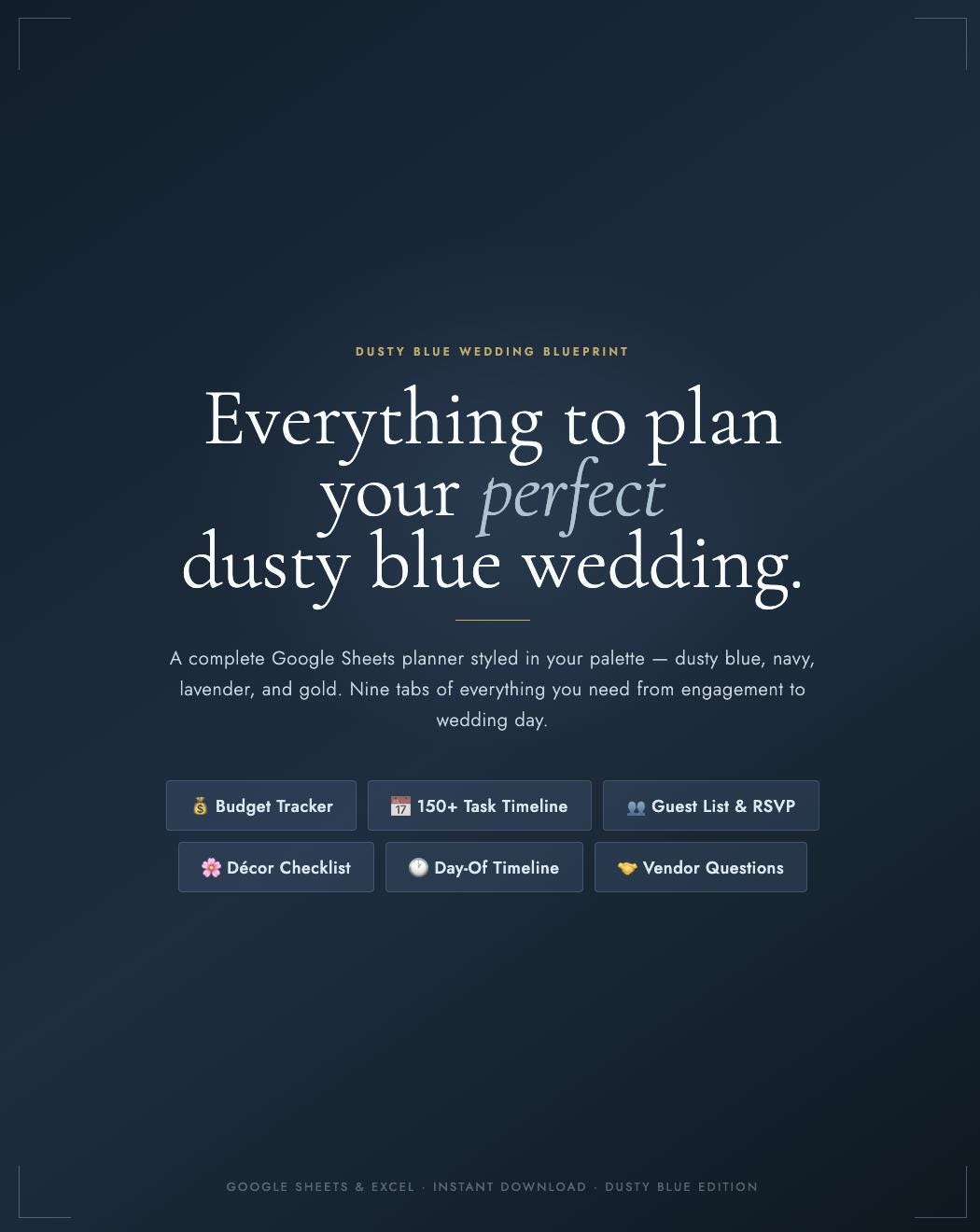 The Dusty Blue Wedding Blueprint is a complete digital planning spreadsheet designed specifically for dusty blue, coastal, and romantic blue-toned weddings. Every tab, every header, every detail is styled in your palette β so planning feels as beautiful as the wedding itself.