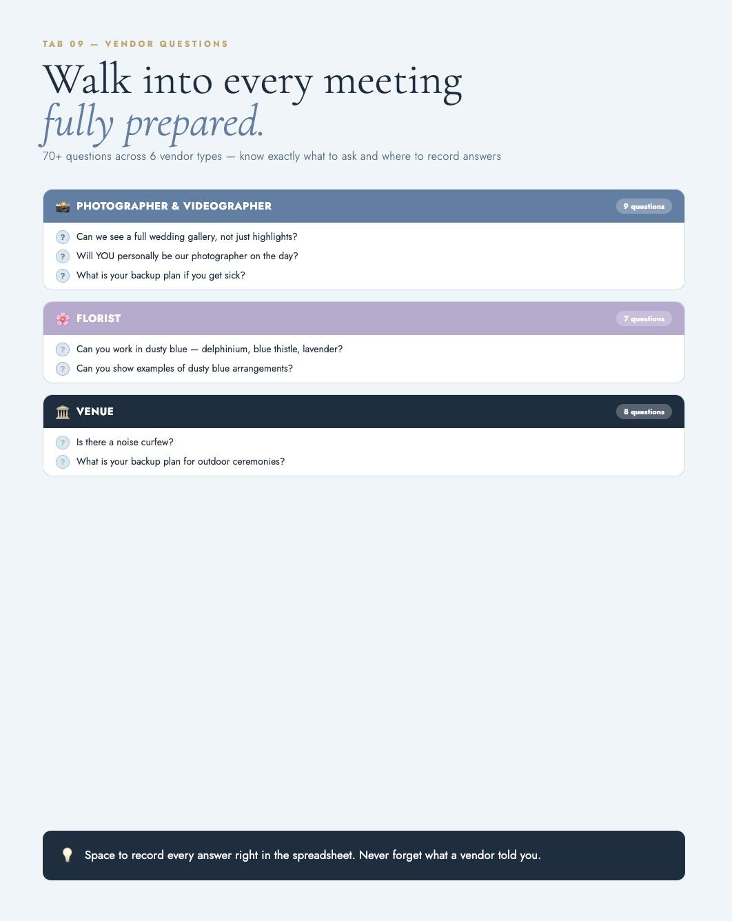 70+ questions to ask across 6 vendor types β photographer, florist, venue, caterer, hair & makeup, DJ. Walk into every meeting prepared.