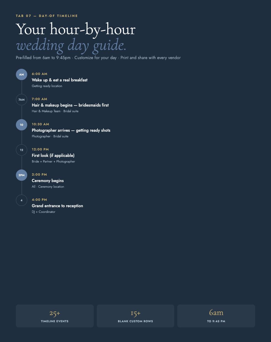 Pre-filled 6amβ9:45pm sample timeline you can customize. Share with every vendor the week before.