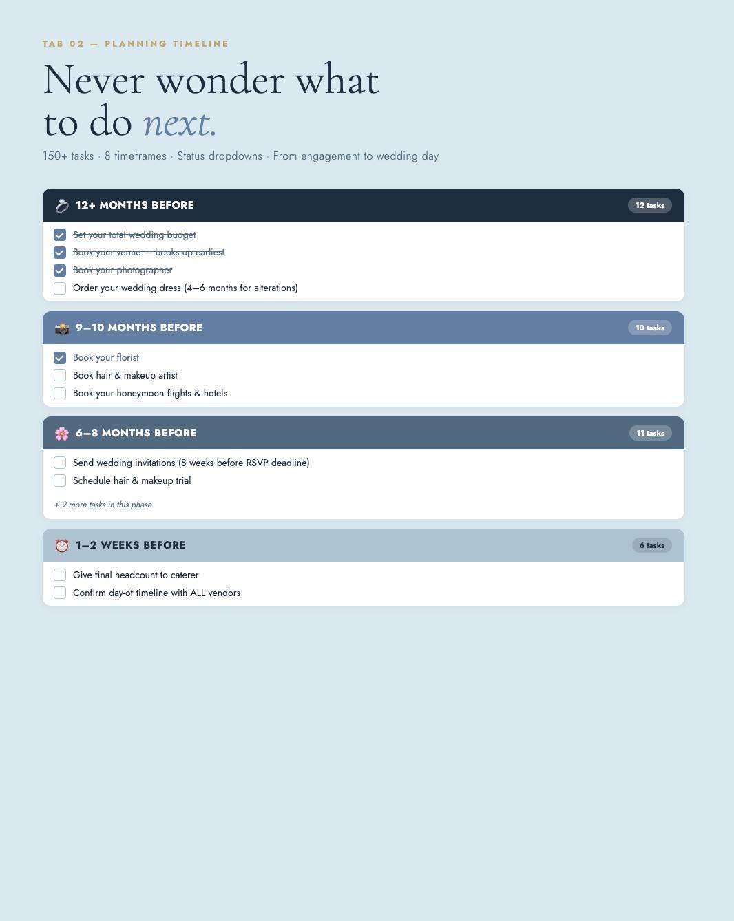 150+ tasks across 8 timeframes β 12+ months before through your wedding day. Status dropdowns. Never wonder what to do next.