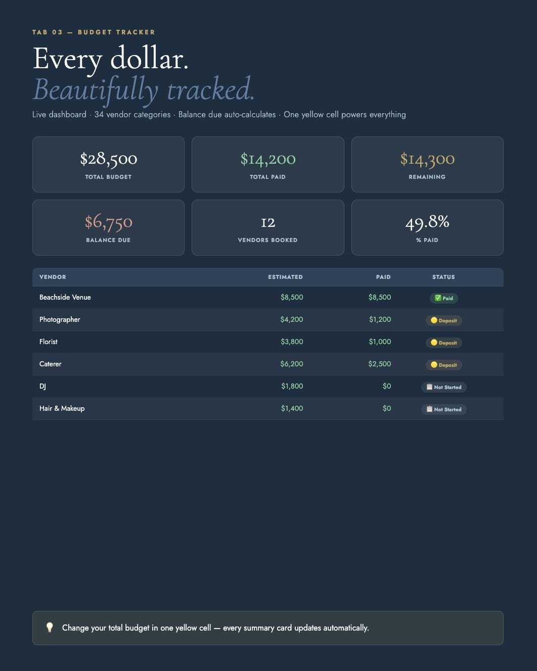 34 vendor categories with auto-calculating totals. Live dashboard showing paid, remaining, and balance due. Enter your budget in one yellow cell and everything updates.