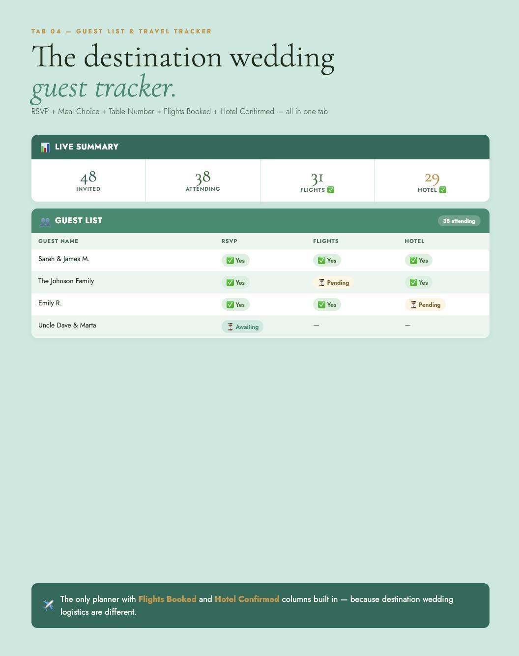120 rows with RSVP, meal choice, table number, AND two extra destination wedding columns: Flights Booked? and Hotel Confirmed? The tracker no generic planner has.