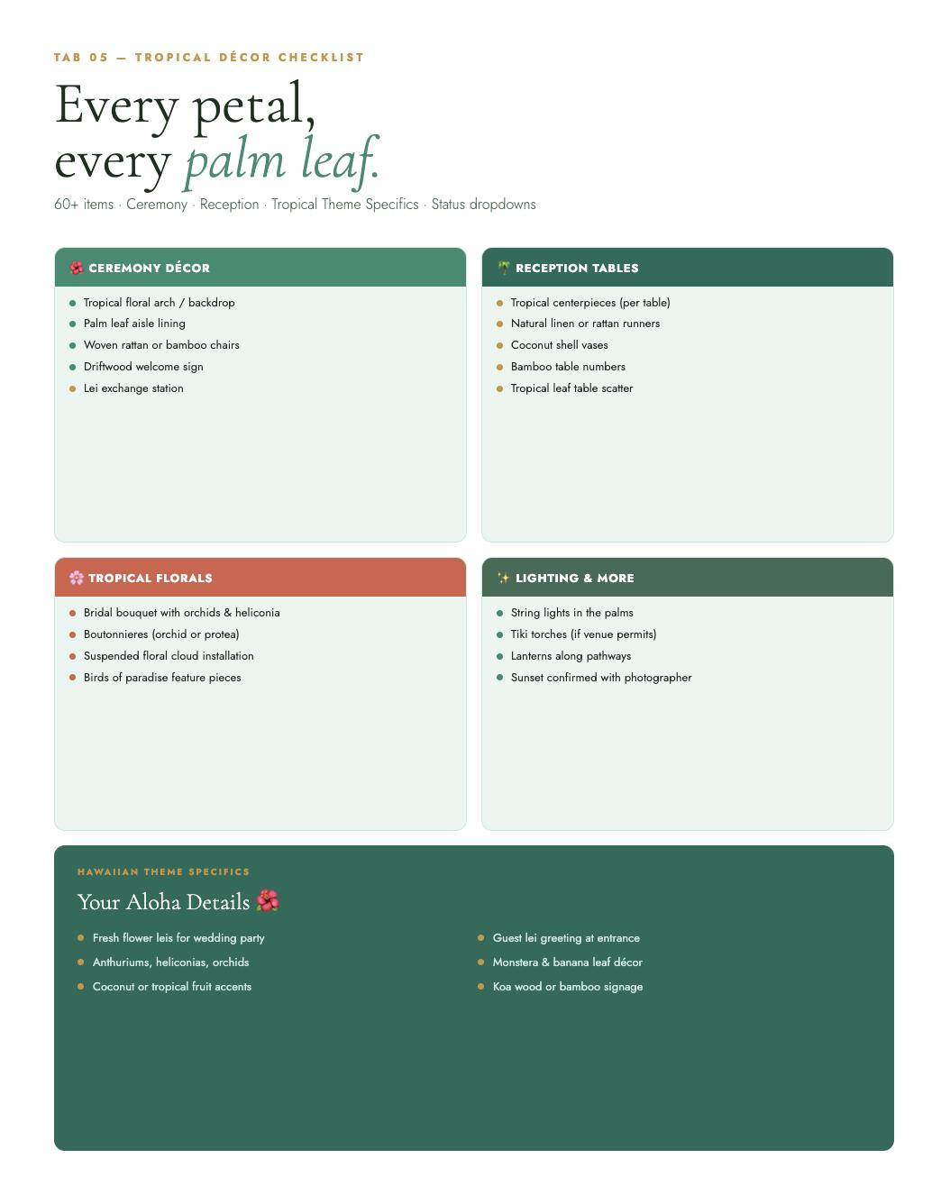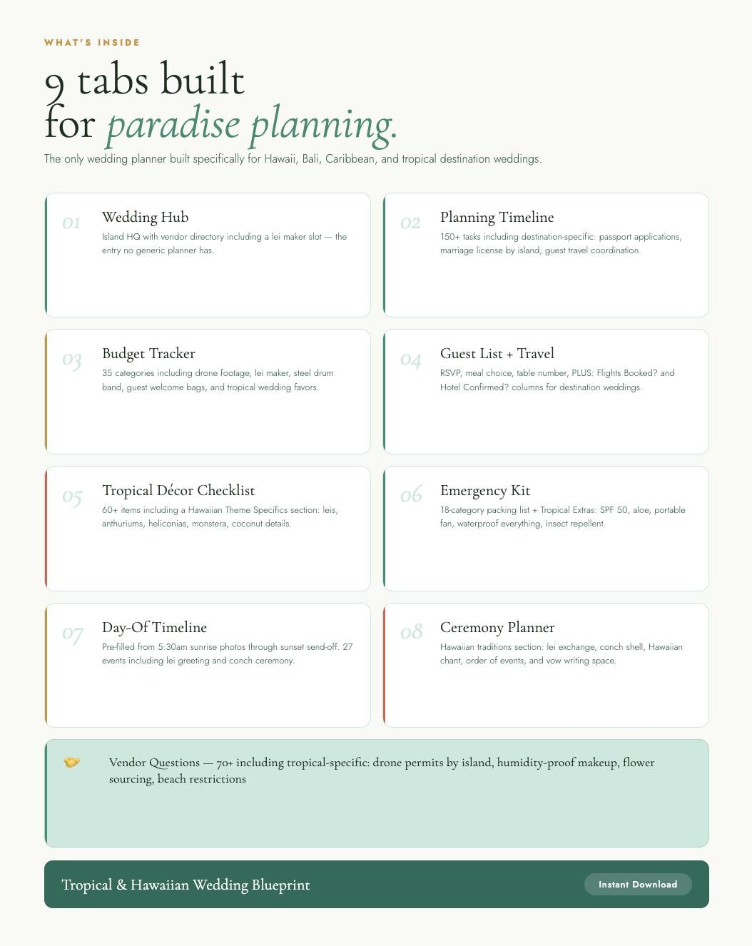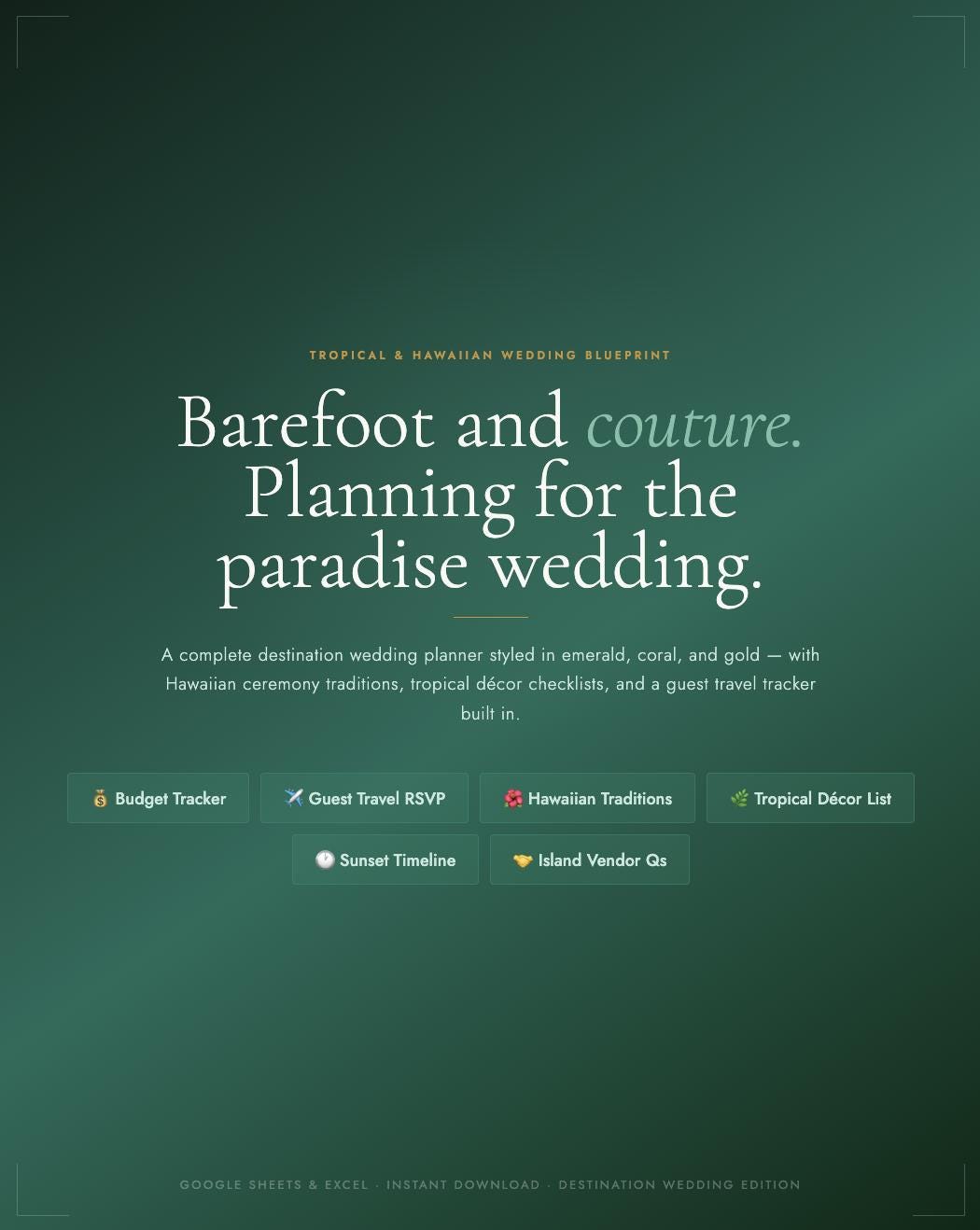 The Tropical & Hawaiian Wedding Blueprint is a complete destination wedding planner styled in an emerald green, coral, and gold palette β built specifically for couples planning in Hawaii, Bali, the Caribbean, or anywhere the tropics call you. Every tab, every checklist, every vendor question is designed with your paradise wedding in mind.