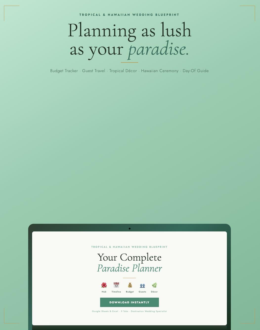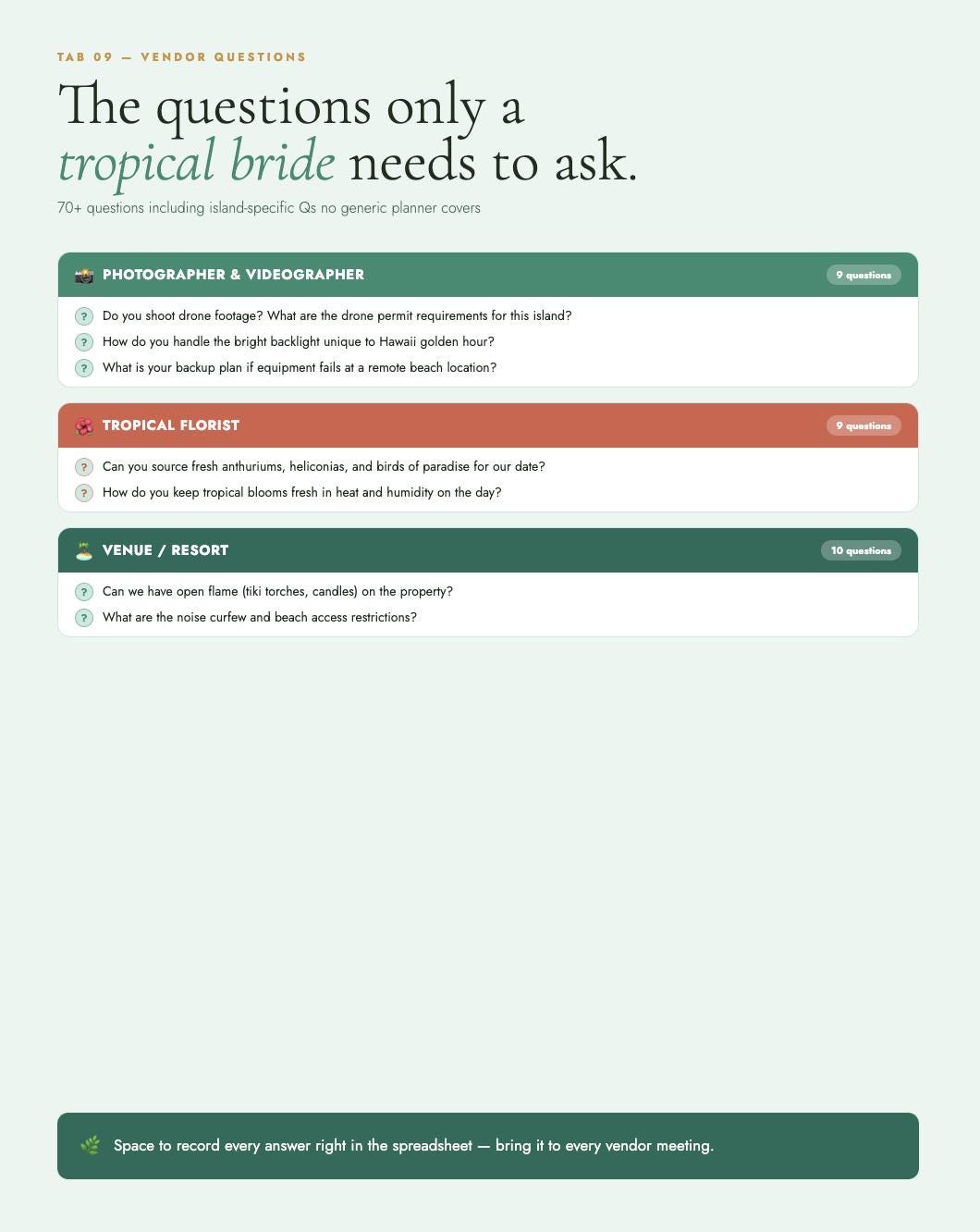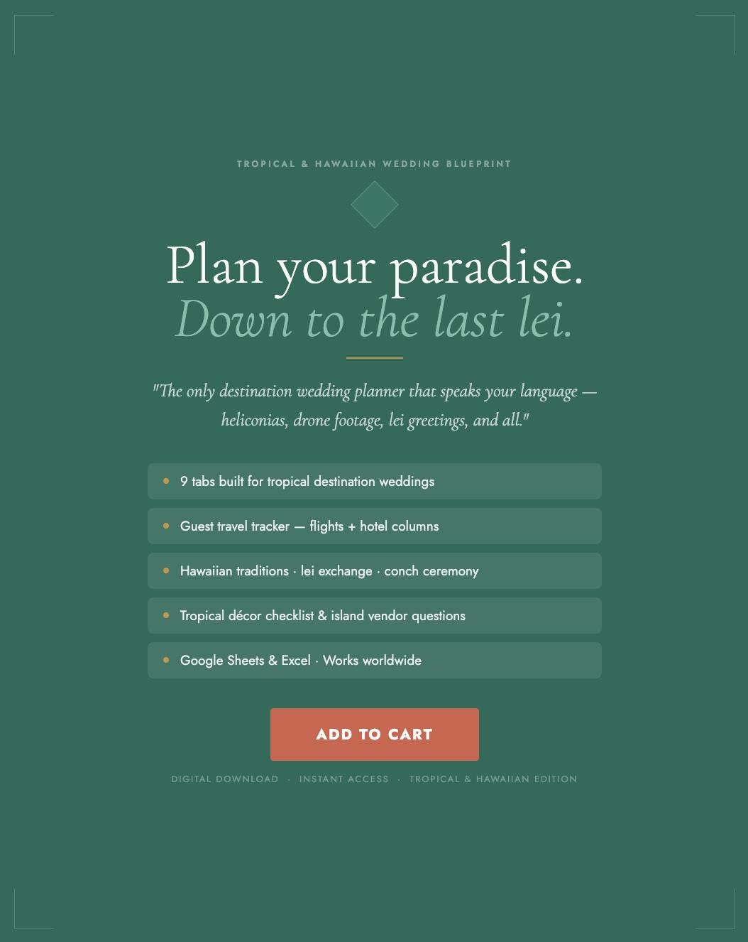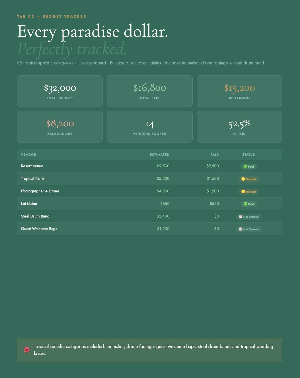 The Tropical & Hawaiian Wedding Blueprint is a complete destination wedding planner styled in an emerald green, coral, and gold palette β built specifically for couples planning in Hawaii, Bali, the Caribbean, or anywhere the tropics call you. Every tab, every checklist, every vendor question is designed with your paradise wedding in mind.