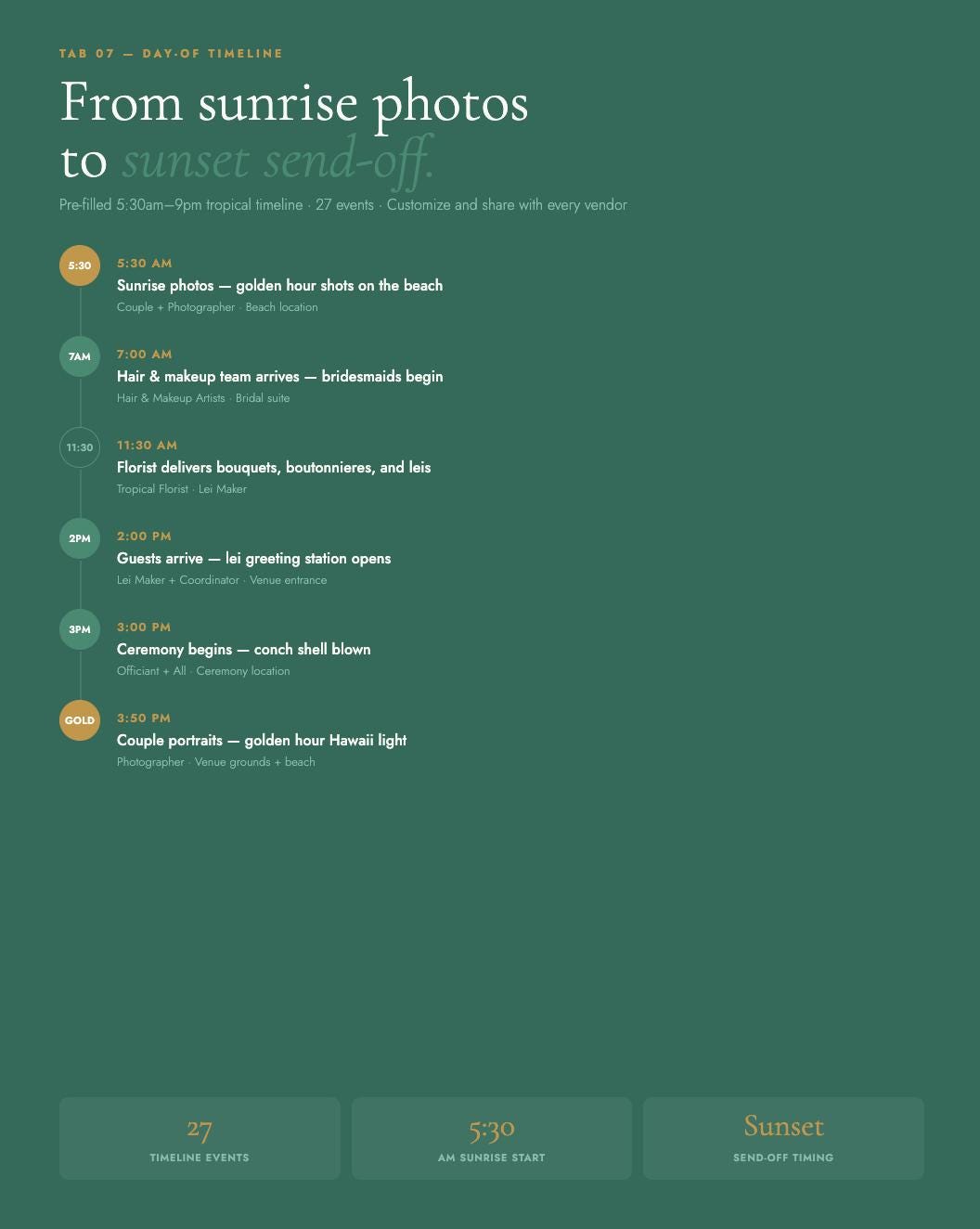 Pre-filled tropical timeline from 5:30am sunrise photos through sunset send-off β 27 events including the lei greeting, golden hour portraits, and conch shell ceremony opener.