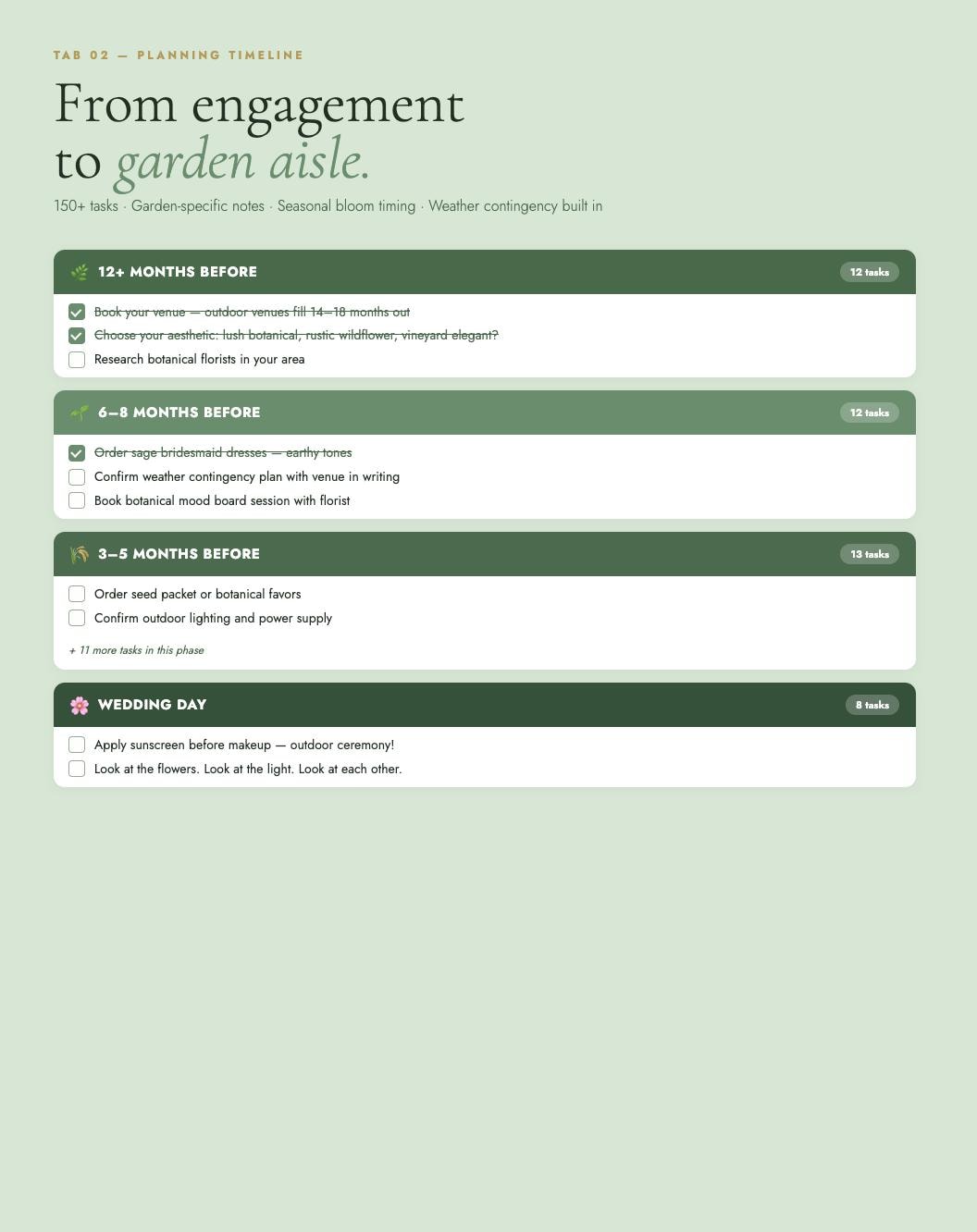 150+ tasks across 8 timeframes with garden-specific notes: seasonal bloom timing, outdoor venue booking windows, weather contingency planning, and when to confirm your rain backup.