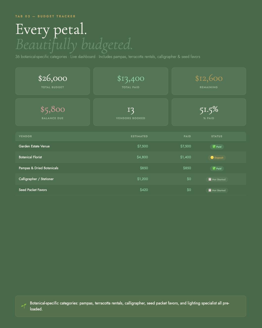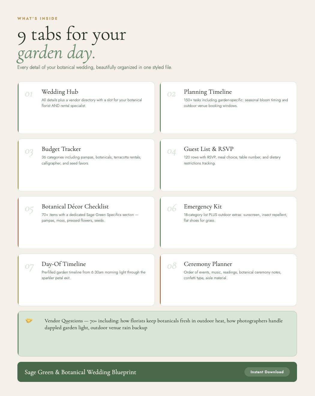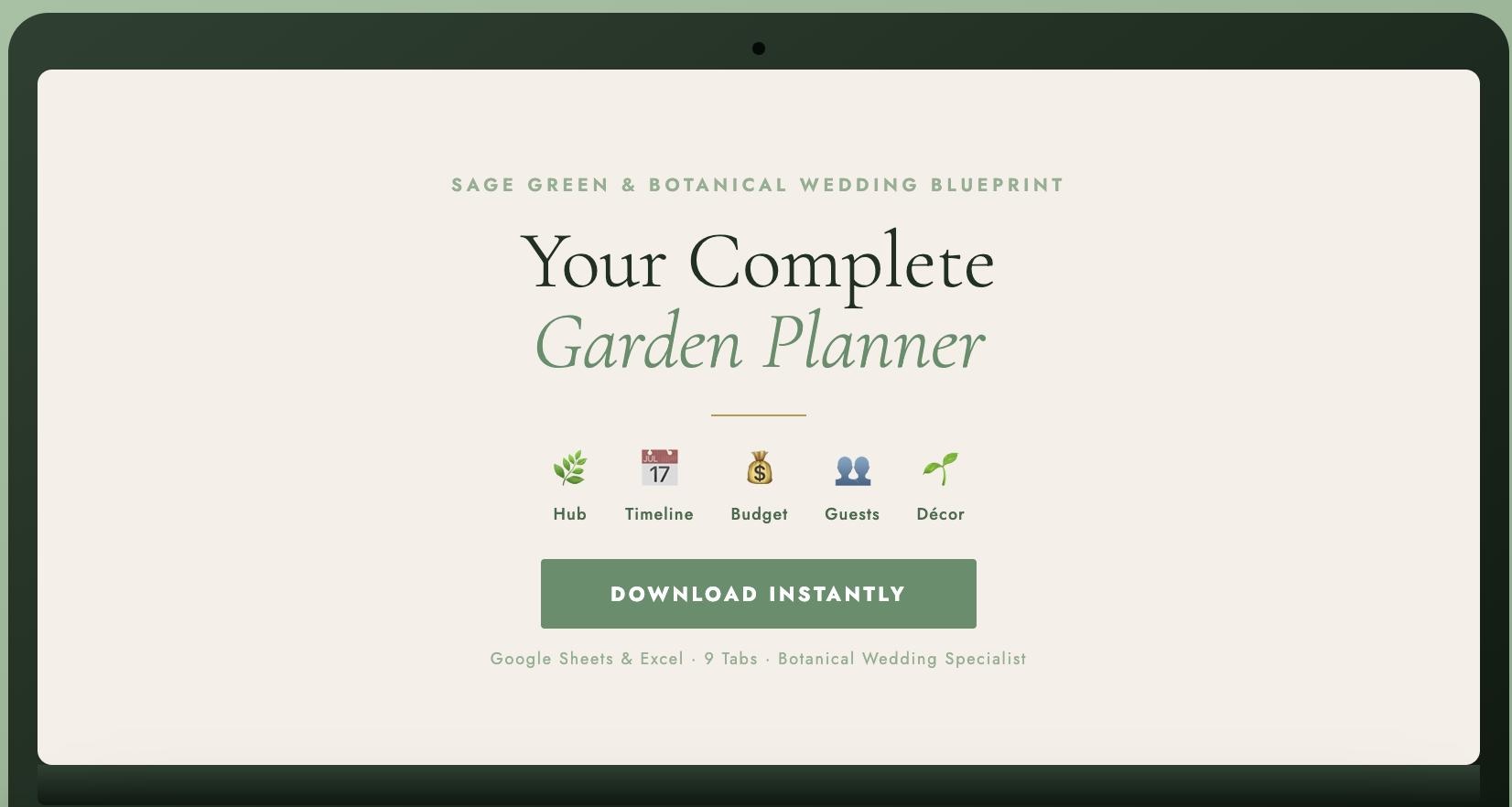 Sage Green Wedding Planner Spreadsheet β Budget Tracker, Checklist | Botanical Wedding Blueprint | Google Sheets | Garden Wedding Gift