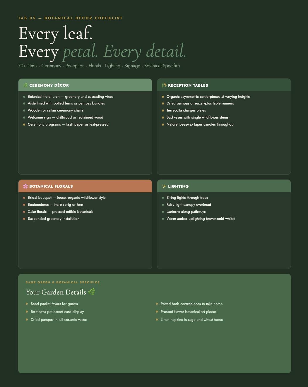 70+ items across ceremony, reception tables, florals, lighting, and signage β plus a dedicated Sage Green & Botanical Specifics section: pressed flowers, seed packet favors, herb centrepieces, pampas vases, and moss details.