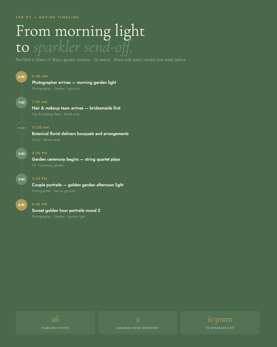 Pre-filled garden wedding timeline from 6:30am morning light through the sparkler or petal exit. 26 events including golden hour portrait windows, acoustic ceremony music, and farm-to-table dinner service.