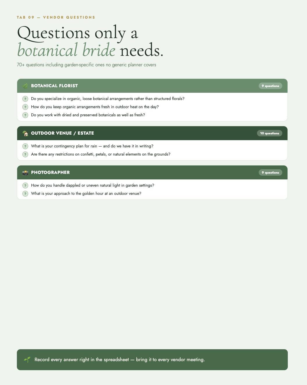 70+ questions across 6 vendor types β including botanical-specific questions: how the florist keeps organic arrangements fresh in outdoor heat, how the photographer handles dappled garden light, how the caterer sources locally.