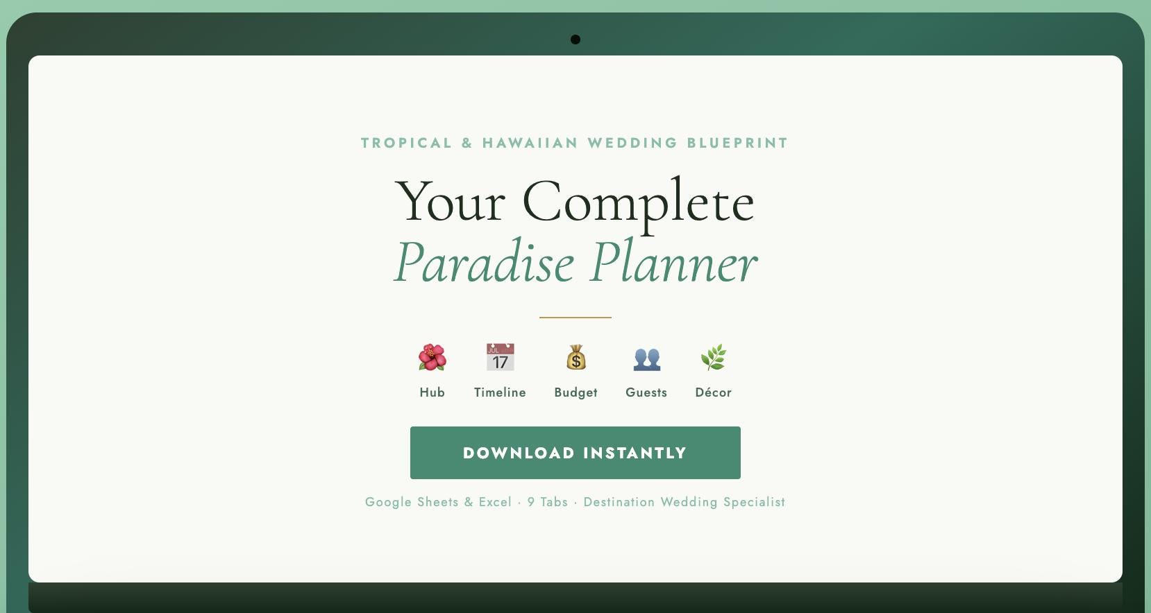 9 tabs built for destination weddings. Google Sheets & Excel. Works from anywhere in the world. Instant download.GET THE TROPICAL BLUEPRINT →Instant download · No subscription · Yours forever